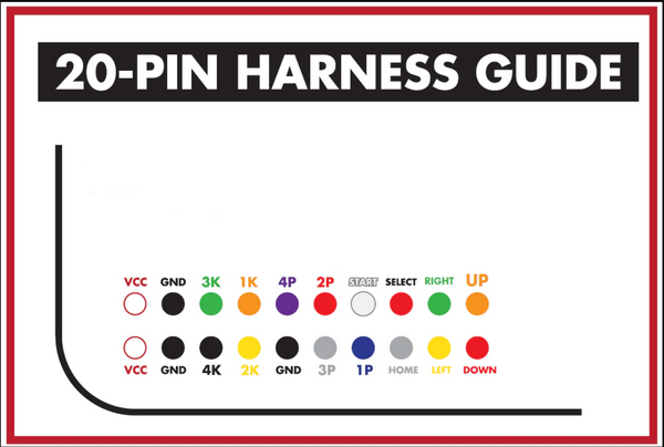 - 20 Pin Brook Harness support (Sold Separately ) + Tool Free push connectors ( Can be double mapped, 2 separate buttons can perform the same action) Guide in pictures, 2 VCC pins are for Extra keyboard Button 1 +2